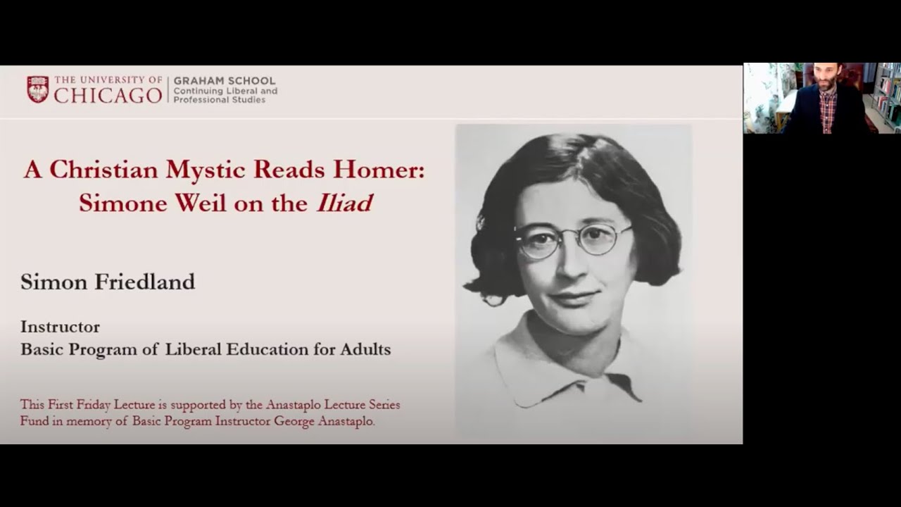 In this First Friday Lecture, we discussed how when Hitler menaced France in the autumn of 1939 Simone Weil (1909-1943) penned one of the century’s most powerful readings of Western literature’s first epic poem. The Iliad or the Poem of Force constitutes a terse and urgent meditation on violence and existential vulnerability in a time of crisis. This lecture, led by a Basic Program Instructor Simon Friedland, will trace out Weil’s understanding of force as the epic’s true protagonist and the surprising connection she draws between The Iliad and the Gospels